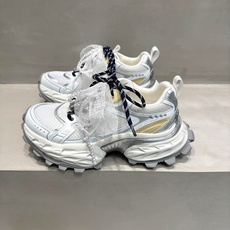 Gu Yun 2025 Spring New Genuine Leather Thick-Soled Women's Shoes Pearl Bow Trendy Cool Mesh Dad Sneakers Sports Casual Shoes
