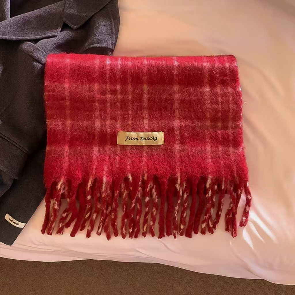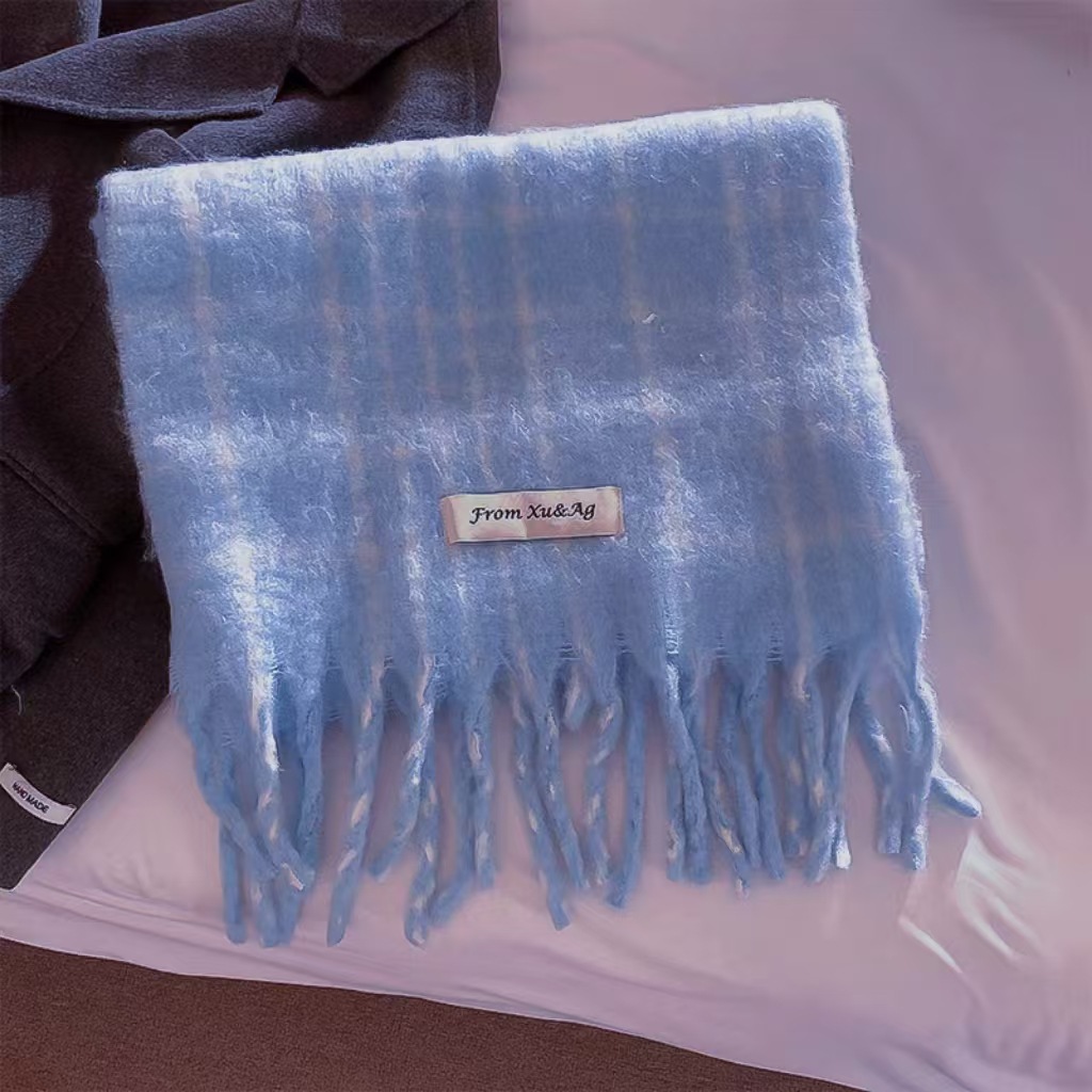 Checkered wool fringe scarf Korean version premium winter mohair warm scarf unisex scarf