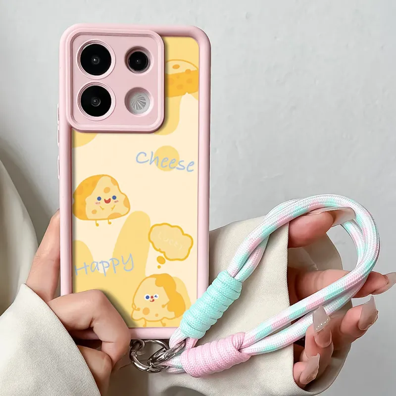 Funny Cheese Phone Case For Redmi Note 14 Pro Xiaomi Poco X7 Pro Wrist Chain Lanyard Hang Strap Soft Silicone Cover