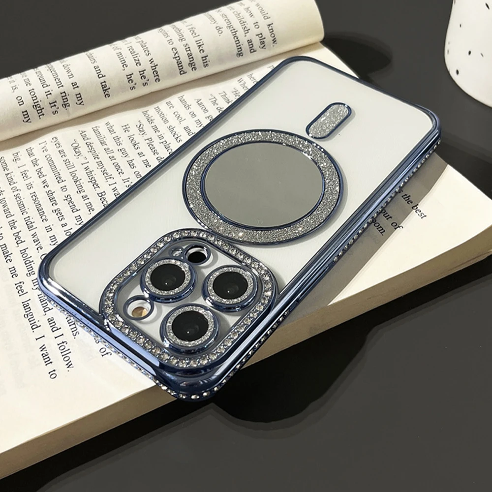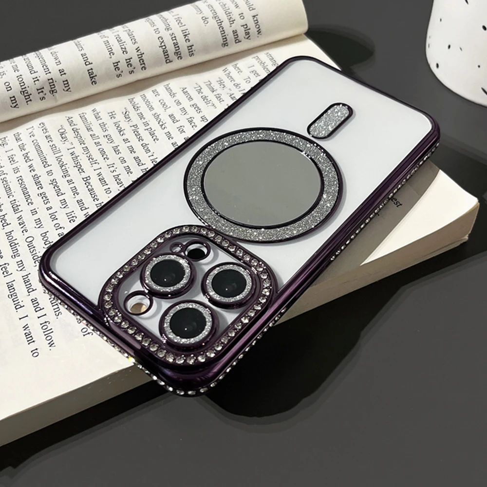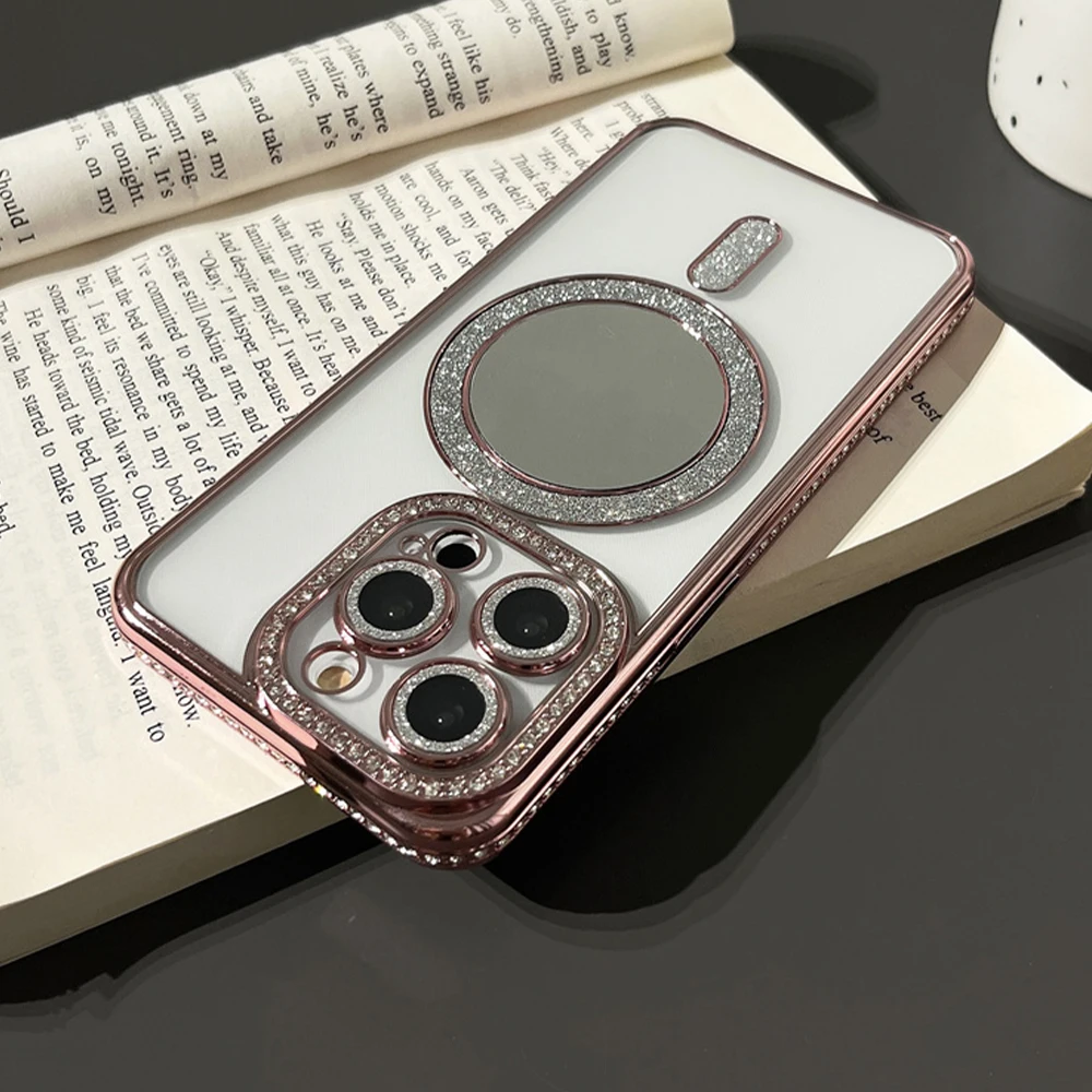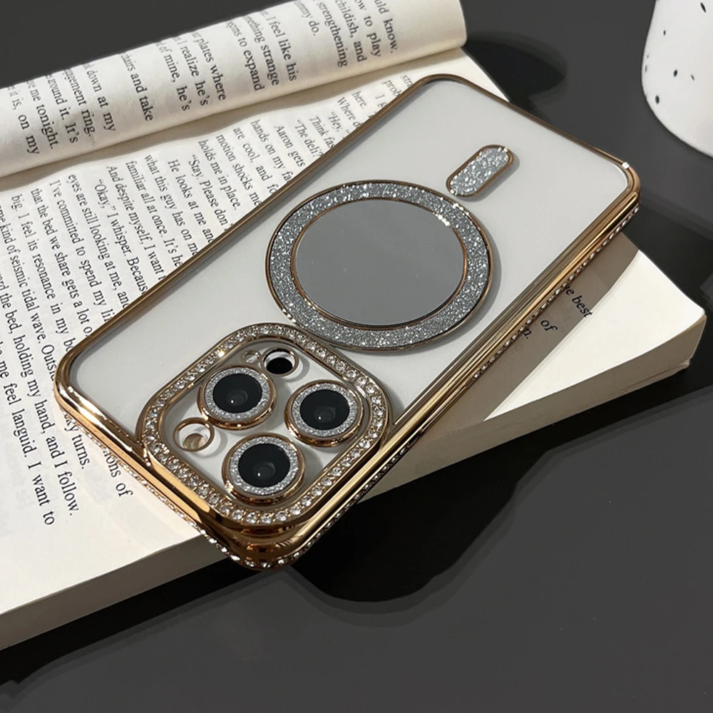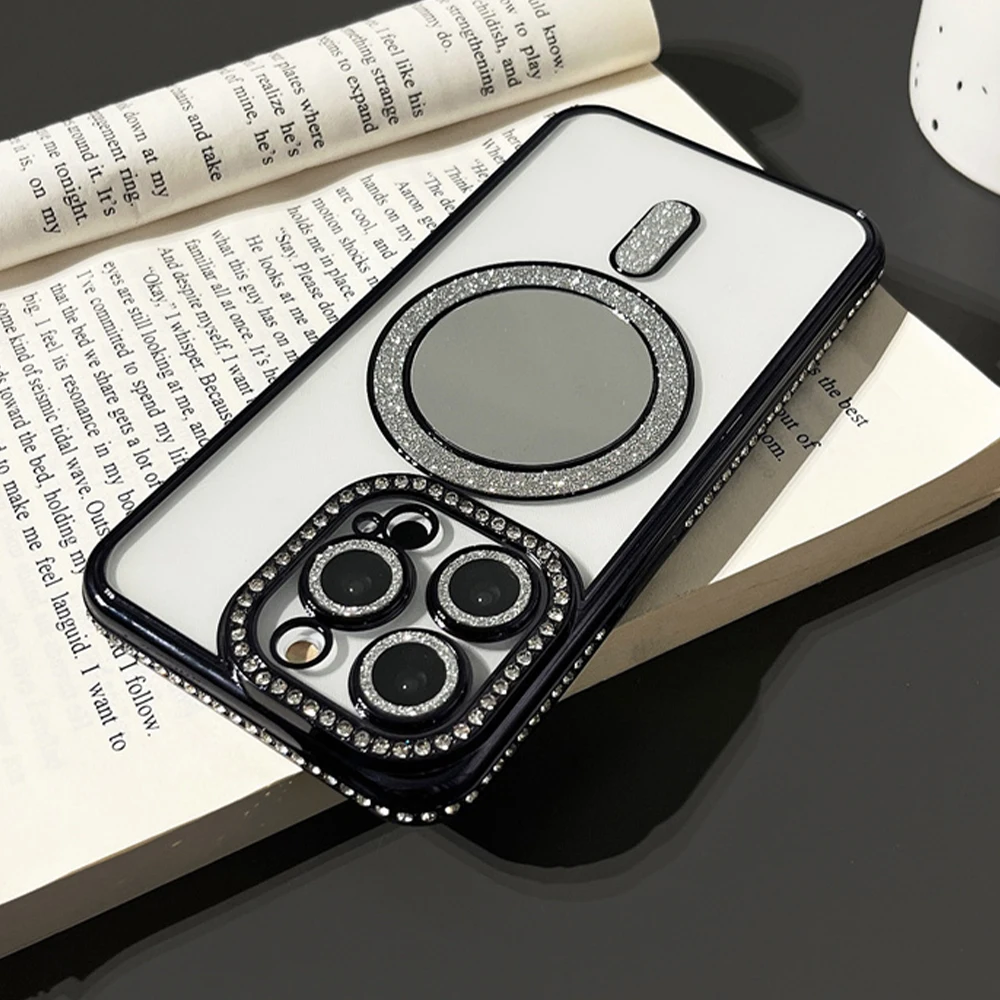 Glitter Magnetic Make Up Mirror Phone Case For iPhone 16 15 11 12 13 14 Pro Max Shiny Diamond Plating Clear Protective Cover