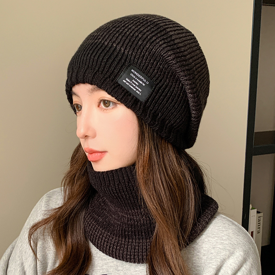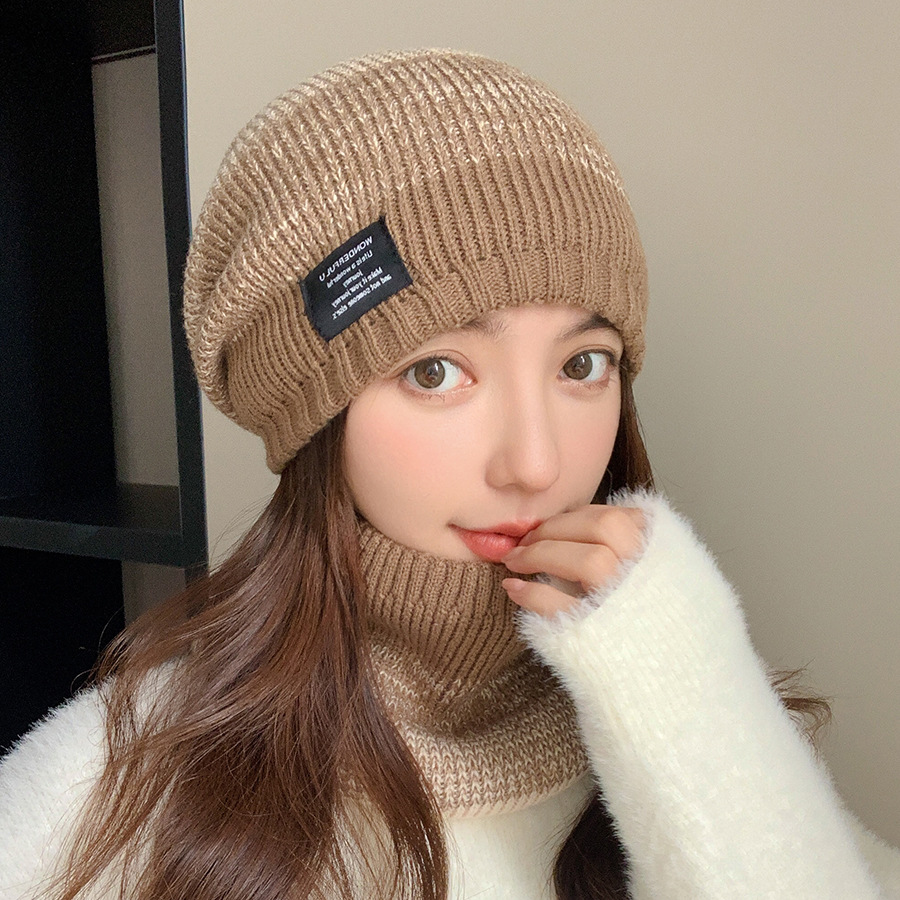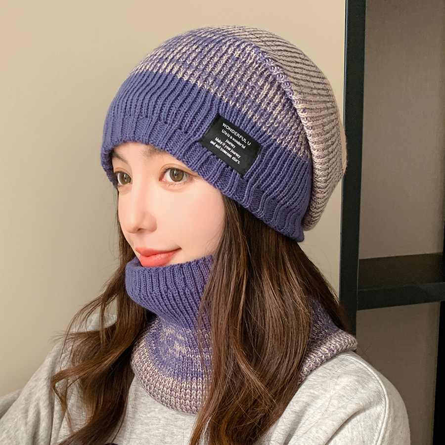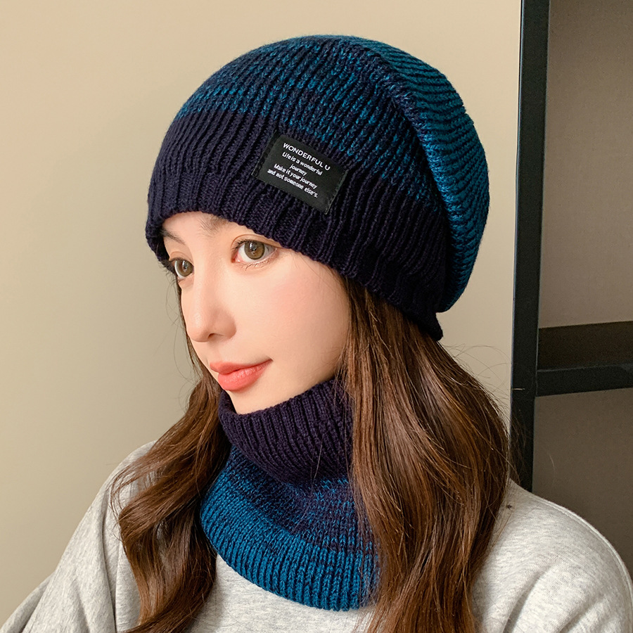 Knitted pullover hat scarf kit men's and women's winter thickened and velvet outdoor face protection two-color knitted hat