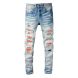 Men's Men Cracked Pleated Patch Jeans Streetwear Slim Skinny Stretch Denim Pants Holes Ripped Patchwork Tapered Trousers
