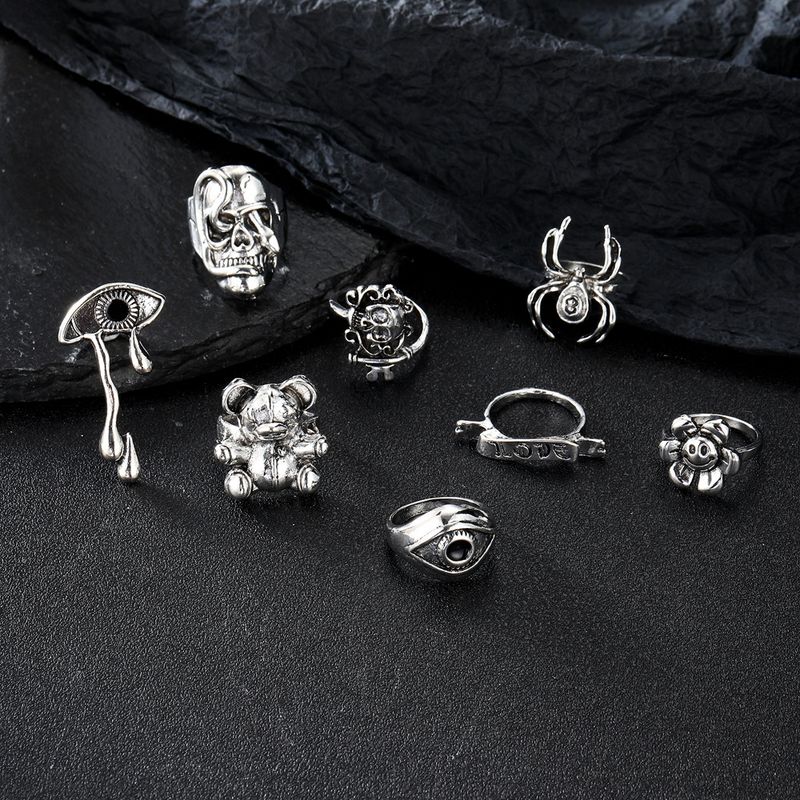 Personalized exaggerated eyes, tears, spider doll, skull, smiling face, flower set of 8 rings