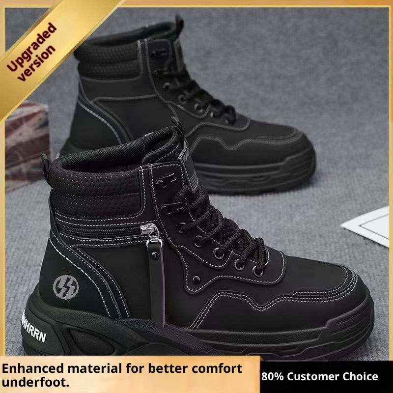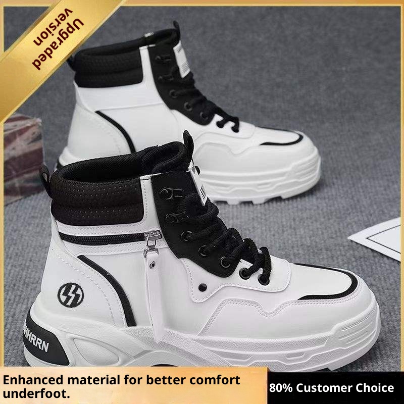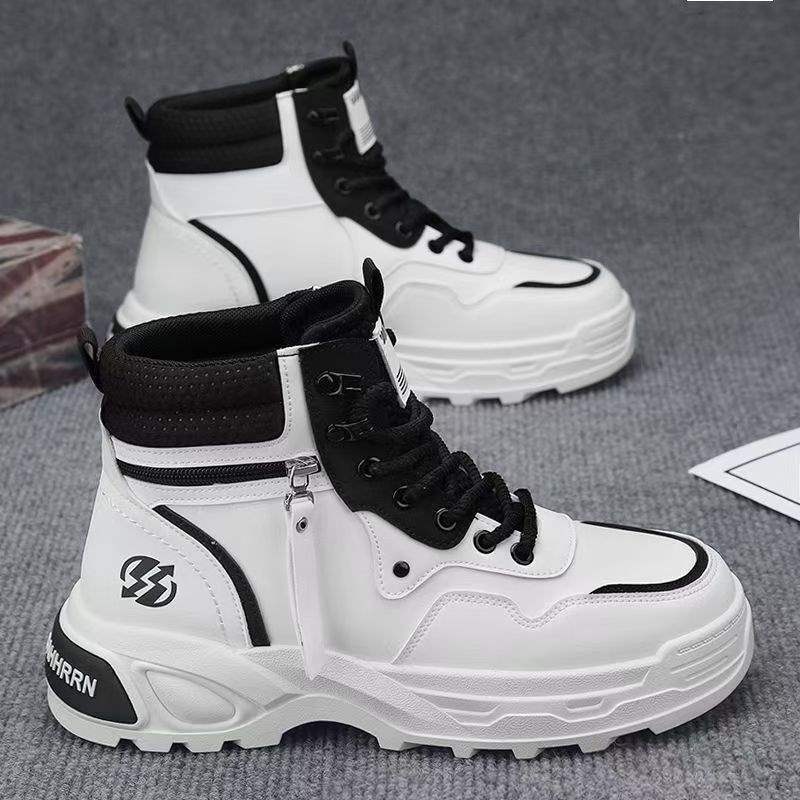 ShoeGlobe High-top Men's Autumn Casual Hiking Sports Non-slip Work Shoes Leather Waterproof Thick Sole Height-increasing White