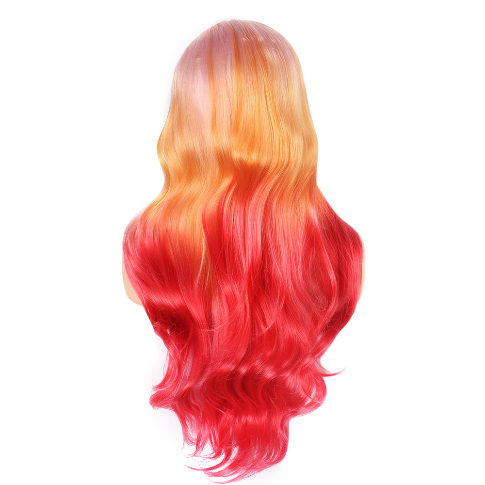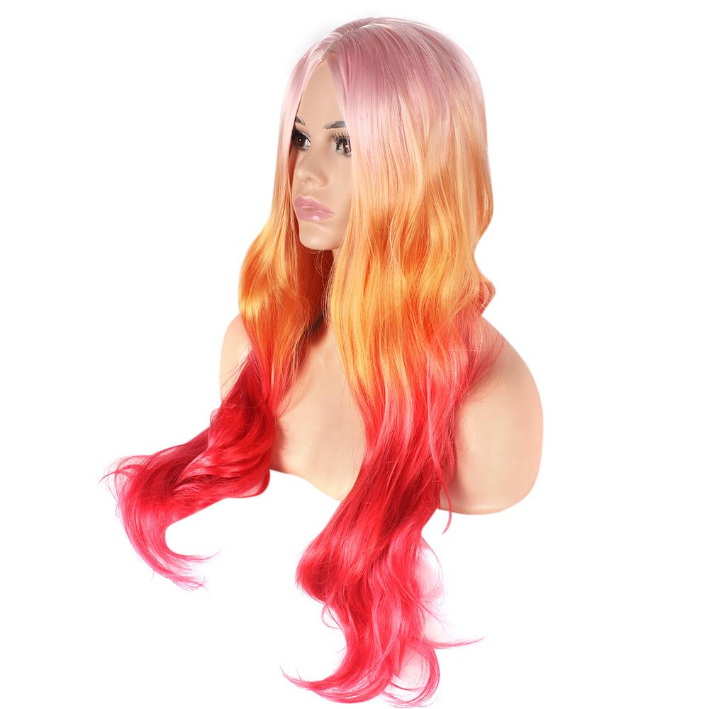 Synthetic wig Women's woven synthetic fiber wig headband with long bangs medium split slightly curled brown gradient pink